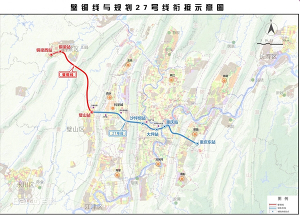 重慶軌道交通27號線是一條東西走向的軌道快線,西起璧山,東至重慶東站,將串聯起大學城、沙坪壩、大坪、南坪、茶園等組團,據公開資料顯示,軌道27號線項目正線全長約 52公里,從璧山出發,向東穿縉云山后,經虎溪站、大學城南站、寨山坪站至西永站,后穿越中梁山至磁器口站、沙坪壩站,石橋鋪站、大坪西站,到達重慶菜園壩火車站,然后穿越長江到達后堡和南坪站,后抵達茶園新區的重慶東站。27號線的定義是一條城軌快線。也就是說該條線路均為大站設計,每個站點之間的間距較長,從而實現更少的??亢透斓乃俣?。27號線的高運行速度高達 140km/h,已經接近于目前的快速列車了。由此可見,27號線是串聯重慶主城東西走向的快速通道,對于完善主城的交通布局,分流一號線的壓力,具有重要的價值和意義。