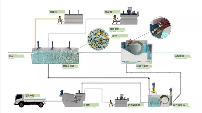 ( 磁力強度是其自身重量的600多倍 ),在瞬間(約2秒鐘內)實現污水固液分離的過程 , 以此達到消除污水中絕大部分污染物的目的,實現水環境水體凈化和水質提升的目標