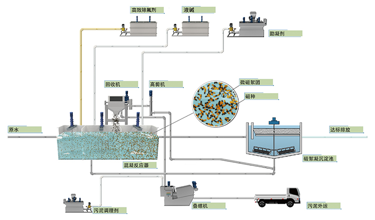 其中,在關鍵工藝“二級除氟沉淀池”段采用了一套50000T/d磁混凝沉淀配套水處理設備。該設備依據重介質加載沉淀原理,通過向污水中投加適量可循環利用的磁種,并使磁種均勻分散到水體中形成微小晶核,以此強化絮凝效果,并最終形成高密度絮凝體(磁種密度為水密度的5.1倍),依靠重力作用和斜管(板)沉淀原理實現固液的高速沉淀分離。同時輔以部分污泥回流系統以增強去除效果和降低藥劑費用。